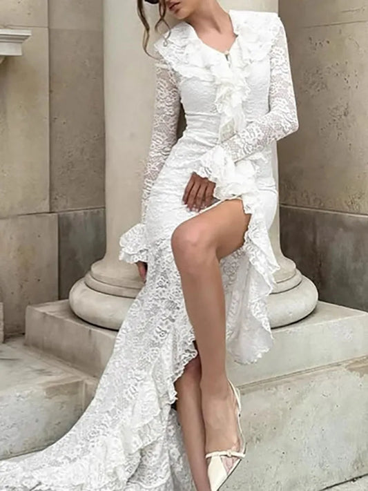 Sexy V-neck Flared Sleeve Bodycon Women Party Dress Casual Street High Waist Long Dress White Ruffled Lace Irregularity Dresses